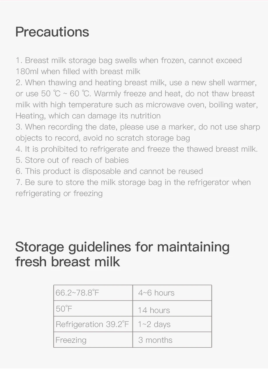 O leite materno incha quando congelado e não pode exceder 6 oz de armazenamento.